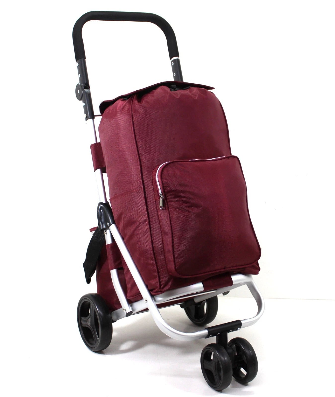 With a spacious main compartment, front zip pocket, two side bottle holders, and a removable cooler bag at the back, you can carry groceries, personal items, and frozen goods with ease. The drawstring top with flap cover keeps your items secure, while the high-density water-repellent polyester ensures durability. When not in use, the trolley folds flat for easy storage.